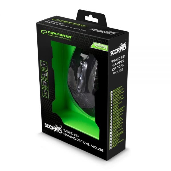 Геймърска мишка Scorpio Функционална геймърска мишка Scorpio, създадена специално за геймъри. Прецизният оптичен сензор с превключваща се разделителна способност позволява прецизно позициониране на курсора в игрите. Ергономичната форма и материалите, използвани за завършване на мишката, предотвратяват умората на ръцете по време на игра. Специално разработена за прилепване към ръката. Страничните бутони „Напред“ и „Назад“ улесняват навигацията в уеб браузъри, игри и други програми. Мишката е с кабел, стабилно закрепен с допълнителен текстилен уплътнител и подсилен USB порт. Определено, ще бъде страхотен инструмент и ще осигури незабравимо изживяване по време на игра.