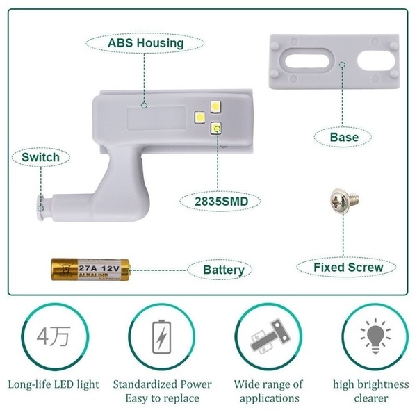 Принцип на работа: LED система за осветление, инсталирайте го на пантата, след инсталирането на батерията; когато отваряте шкафа си,