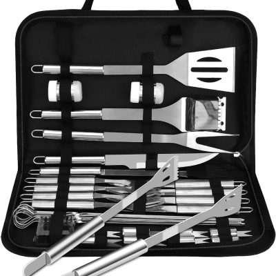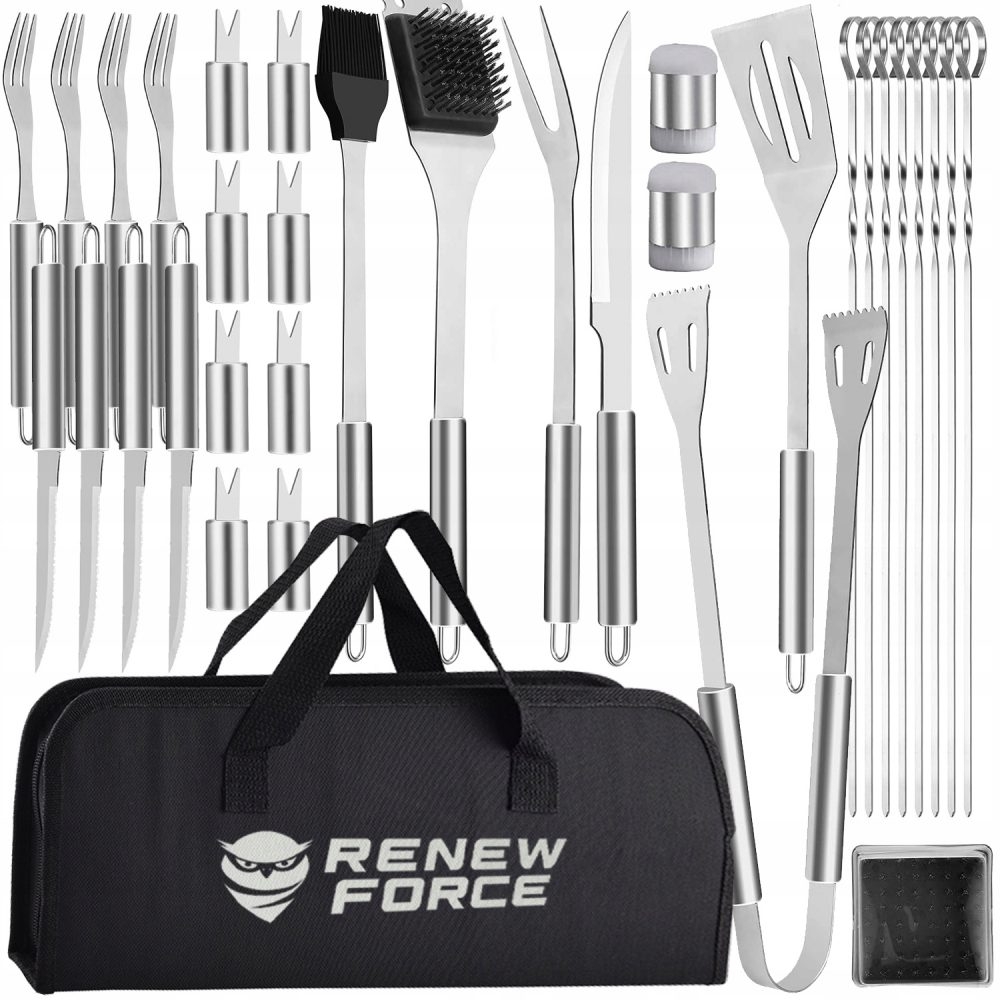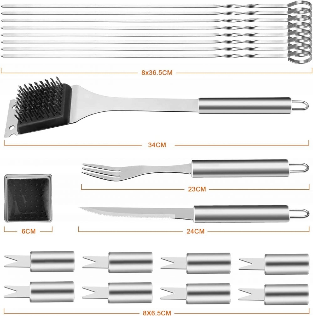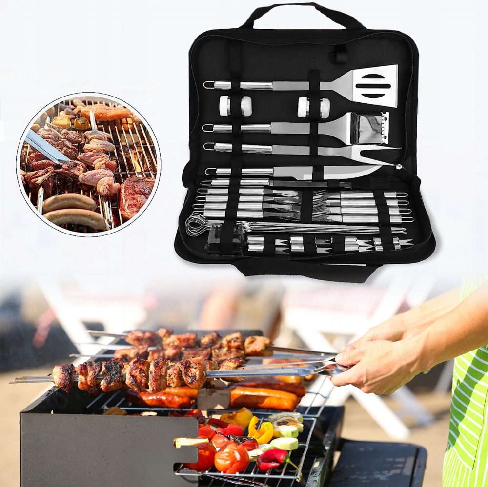 Цели 33 прибора за барбекю затворени в практичен калъф с цип и дръжка за транспортиране.