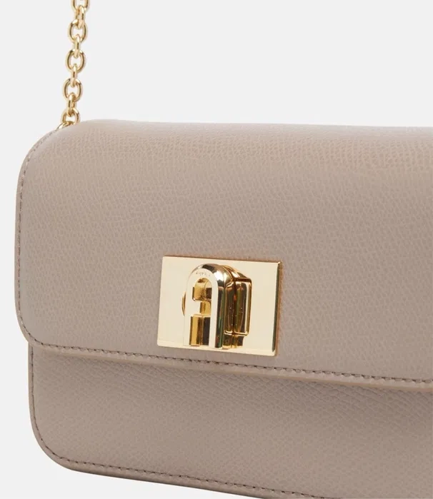 Дамската чанта Furla Crossbody в елегантен неутрален бежов / taupe цвят е перфектният аксесоар за жени, които ценят стил, качество и практичност. Изработена от висококачествена естествена кожа с фин релеф, чантата впечатлява със своя изискан външен вид и класически дизайн, който лесно се комбинира с всеки сезонен и ежедневен аутфит. Моделът е оборудван със стилно метално закопчаване в златист цвят, украсено с гравираното лого Furla, което подчертава неговия премиум характер. Леката и удобна златиста верижка позволява crossbody носене, осигурявайки комфорт и свобода на движение. Това е идеалната чанта за дами, които търсят оригинална Furla crossbody чанта, съчетаваща изтънчен дизайн, практична форма и високо качество.