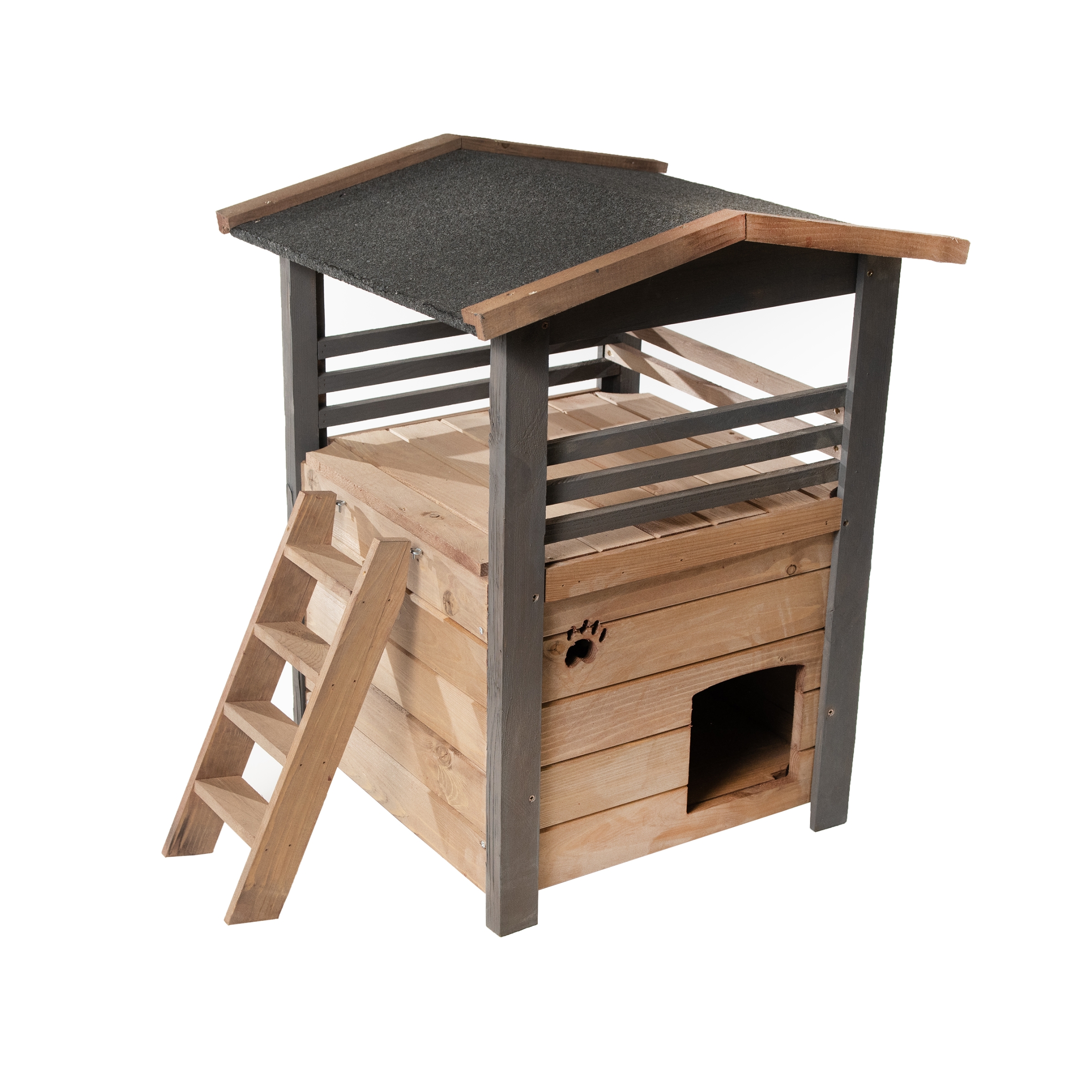 Тази котешка къща е изработена от масивна чамова дървесина и оцветена с безвредни за животните и околната среда бои. Покрита е с битум, което я прави устойчива на всякакви атмосферни условия. Направена е с регулируеми крака за по-голяма устойчивост на всякаква повърхност. Има просторна тераса за сладка дрямка. Вътре в къщичката или на терасата вашият любимец ще се чувства удобно, защитен от всякакви атмосферни условия.